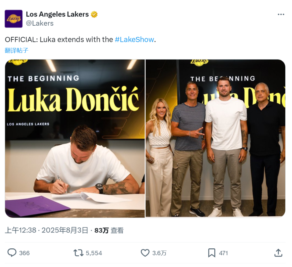 北京时间8月3日凌晨,洛杉矶湖人官方宣布:球队正式跟东契奇完成续约。合同并非此前爆料的4年2.29亿美元,而是3年1.65亿美元,2028-29赛季是球员选项。东契奇当场宣布捐赠500万美元,帮助全球77名年轻球员追逐梦想。
